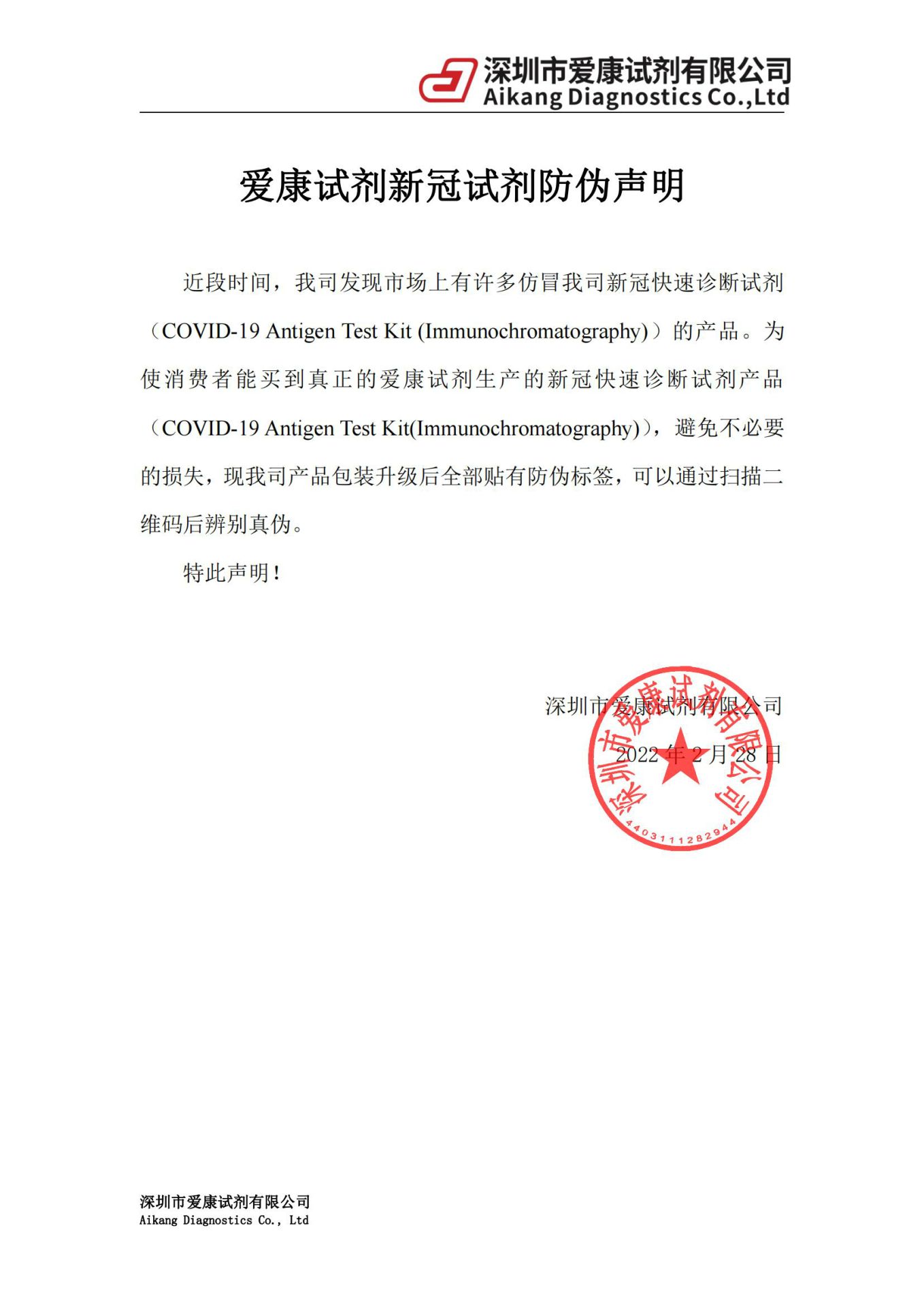 爱康试剂新冠试剂防伪声明